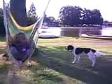Matthew Whitworth zag dat zijn zoon 'Cooper!' riep naar de hond waar zijn moeder en tante me aan het wandelen waren op de boerderij. Hij besloot hem te filmen, maar de jongen was zo enthousiast dat hij van de veranda viel.