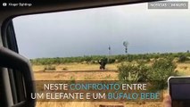 Búfalo bebé mostra a elefante quem manda