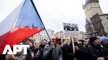 Czechs gather outside the Russian embassy in Prague to protest, angry over Russia's alleged involvement in a 2014 explosion in the east of the country. The government said Saturday it would expel 18 Russian diplomats seen as secret agents in retaliation, saying Russia's military intelligence GRU had been involved in the explosion of a military ammunition warehouse in 2014 that killed two people.