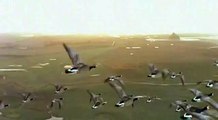 A huge flock of snow geese was migrating from Melville, Canada in the month of April. Thousands of birds flew through the clear blue sky during the daytime.
