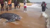 Des villageois encouragent une tortue à repartir en mer