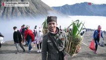Thousands of worshippers trudge up an active Indonesian volcano in eastern Java to cast livestock and other offerings down its smouldering crater in a centuries-old religious ceremony. Every year people from the Tengger tribe gather from the surrounding highlands to cast fruit, vegetables, flowers, and even livestock such as goats and chickens into Mount Bromo's crater as part of the Yadnya Kasada festival.