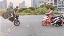 Occurred on July 10, 2021 / Chicago, Illinois, USA<br /><br />: Stunt ride in Chicago, Illinois. As riders were making their way through their route, 1 rider attempted a left-hand drag wheelie. While attempting this his bike "pancaked" on the left side dragging the rider behind it. That bike went into the left lane and connected with another that was already doing a wheelie. 2nd bike flips, lands on the gas tank, and ruptures the tank letting loose most of its gas, and gets ignited by sparks, causing the massive fire. I was told both riders are ok but one suffered a broken arm.<br /><br />Credit: Moto FPV