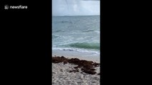 Person At Beach Spots Water Spout Moving Around Ship