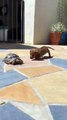 'It's not every day that you get to see a tortoise chasing a dog, so ENJOY!<br /><br />Filmed by Anthony Armstrong, this video features the filmer's pet chihuahua, Becky trying to take a dump when she spots a curious tortoise coming her way. The reptile ends up chasing the doggo all over the yard. <br /><br />Anthony said: "I am a full-time dad who loves my kids and animals, and also loves making funny videos."<br /><br />This humorous footage was filmed in Mesa, AZ on September 1, 2021. <br /><br />Name: Anthony Armstrong<br />Location: Mesa, AZ, USA'<br />WooGlobe Ref : WGA721830<br />For licensing and to use this video, please email licensing@wooglobe.com