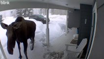 Occurred on September 5, 2021 / Fairbanks, Alaska, USA<br /><br />Info from Licensor: "Moose visit our yard in Fairbanks often during the year but especially in the fall to clean out my garden while they’re fattening up for the winter ahead. I’ve learned to plant carrots for the moose and tomatoes, zucchini, and sunflowers for me. Our garden boxes are up against the house so when the moose come around we can get an up-close and personal view. On this day we had extra special visitors, a cow, and her twins! The young ones were so curious smelling around our backyard table, and so close my husband could have reached out and petted them. But when it came to momma moose eating his crab apple tree, no no!! Later I saw that they had indeed snacked on the garden carrots and then moved on to the neighbors garden."