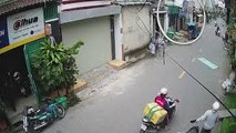 Occurred on October 14, 2021 / Ho Chi Minh, Vietnam<br /><br />Info: A passing motorcyclist is nearly hit by a piece of metal roofing that came down.