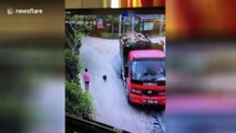 Two girls on scooter escape after falling under lorry