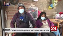 Cámaras de seguridad grabaron el momento en que dos delincuentes la interceptan para robarle sus pertenencias.