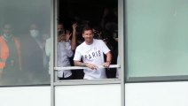 Lionel Messi waves from airport window upon arrival in Paris