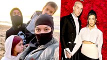 Kourtney Kardashian donned a black top printed with red guitars, which she complemented with red pants.