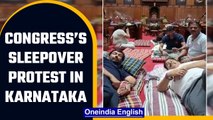 Congress MLAs staged an overnight protest in the Karnataka Assembly demanding the resignation of state minister K S Eshwarappa over his controversial remark that the saffron flag in the future could become the national flag and it will be unfurled at the Red Fort.