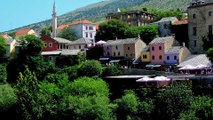 Various people, probably tourists in walk and sightseeing of Bazaar and Old Town in Mostar, Bosnia and Herzegovina.
