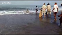 Moment police officer picks up alligator from swimming pool with bare hands