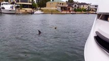 'Tourist joined by a pod of playful dolphins while boating in Mandurah, Australia'