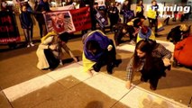 Warga Ukraina memasang tanda di luar teater Praha satu tahun setelah pengeboman Mariupol