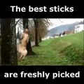 Ce chien ambitieux veut attraper un baton encore accroché à l'arbre...