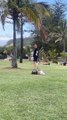 This kid came up with a new idea of fun. He held a battery car from behind and got dragged on the grass. He seemed to enjoy the ride while the woman drove it.