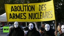 Des français rendent hommage aux victimes d’Hiroshima lors d’une manifestation antinucléaire à Paris