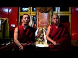 Tibetan temple music is particularly renowned in the west for its two forms of multiphonic singing known as jok-kay (low tone) and bar-da (high tone). In both forms, each of the main chantmasters simultaneously intones three notes, thus each individually creating a complete chord. The Tibetans are the only culture on earth that cultivate this most extraordinary vocal ability. This tradition is also known as "overtone singing" because it is accomplished by means of learning to control the muscles of the vocal cavity and then re-shaping it while singing, thus intensifying the natural overtones of the voice. In effect, the body is transformed into an effective overtone amplifier. <br /><br />One night in 1433, the Tibetan lama Je Tzong Sherab Senge awoke from a startling dream. In it he had heard a voice unlike any voice that had ever sounded on the planet. It was a low voice, unbelievably deep, sounding more like the growl of a wild bull than anything human. Combined with this first voice, there was a second. This voice was high and pure, like the sound of a child singing. These two voices, so totally different, had come from the same source and that source was Je Tzong Sherab Senge himself.<br /><br />In this dream, Je Tzong Sherab Senge had been instructed to take this special voice and use it for a new chanting style that would embody both the masculine and feminine aspects of divine energy. It was a tantric voice, a sound that could unite those chanting it in a web of universal consciousness.The next morning, Je Tzong Sherab Senge began to chant his daily prayers. The sounds that came out of him were the sounds he had heard in his dream — unearthly sounds, tantric sounds — and he gathered his fellow monks together to tell them of his dream.<br /><br />That year, more than 500 years ago, the Gyume Tantric Monastery began in Lhasa , Tibet . The monks of this monastery learned to chant in the same voice which Je Tzong Sherab Senge had heard in his dream. It was a voice that enabled each monk to chant three notes at the same time, creating 'One Voice Chords'. Within that same century, another monastery in Lhasa , the Gyuto Tantric College , was founded. The monks at this fellow Tantric College also incorporated this chanting technique <br /><br />Source: www.chantmaster.org<br /><br />This footage is part of the professionally-shot broadcast stock footage archive of Wilderness Films India Ltd., the largest collection of HD imagery from South Asia. The Wilderness Films India collection comprises of tens of thousands of hours of high quality broadcast imagery, mostly shot on HDCAM 1080i High Definition, HDV and XDCAM. Write to us for licensing this footage on a broadcast format, for use in your production! We are happy to be commissioned to film for you or else provide you with broadcast crewing and production solutions across South Asia. We pride ourselves in bringing the best of India and South Asia to the world... Reach us at rupindang [at] gmail [dot] com and admin@wildfilmsindia.com.<br /><br />