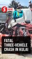 A shipping container fell off a bridge and fell 12m to the ground below, crushing two vehicles and injuring one person along Jalan Pelabuhan Klang on Tuesday (April 5).<br /><br />Read more at https://bit.ly/3JcopvT<br /><br />WATCH MORE: https://thestartv.com/c/news<br />SUBSCRIBE: https://cutt.ly/TheStar<br />LIKE: https://fb.com/TheStarOnline