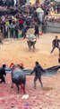 Two buffaloes are pitted at a traditional event.