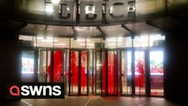 Red blood-like paint splattered on BBC HQ - following a visit from a vandal in the early hours
