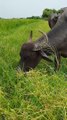 Buffalo cows are grazing green grass in the fields in the village