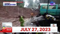 Narito ang mga balitang dapat n'yong malaman sa State of the Nation ngayong Miyerkoles, July 27, 2022:<br /><br />- Bahagi ng Bantay Bell tower at Santa Catalina de Alejandría Parish Church, napinsala ng magnitude 7 na lindol<br /><br />- Pagkain, problema ng mga residente; Pagkontrol sa supply ng gasolina, ipinag-utos ng Bangued LGU<br /><br />- Magnitude 7 na lindol, naramdaman din sa Bulacan at Nueva Ecija<br /><br />- Pres. Marcos, naramdaman daw ang Magnitude 7.0 na lindol habang nasa opisina kaninang umaga<br /><br />- Aftershocks, posible pang maramdaman sa susunod na 2-3 araw, ayon sa Phivolcs<br /><br />- IM Ready sa lindol at aftershocks<br /><br />- 7 patay, matapos bumigay ang isang lumang tulay sa Dasmariñas, Cavite<br /><br />- Pagyanig ng lindol sa Urdaneta City, nakuhaan ng CCTV<br /><br />- Lalaking pinaghahanap matapos lumubog ang 2 bangka sa fluvial parade, bangkay nang natagpuan<br /><br />- Empleyado, sa labas ng kapitolyo ng Abra itinuloy ang trabaho matapos lumindol<br /><br />For Kapuso abroad, subscribe to GMA Pinoy TV (http://www.gmapinoytv.com/) for GMA programs, including the full version of State of the Nation.<br /><br />State of the Nation is a nightly newscast anchored by Atom Araullo and Maki Pulido. It airs Mondays to Fridays at 10:20 PM (PHL Time) on GTV. For more videos from State of the Nation, visit http://www.gmanews.tv/stateofthenation.