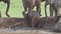 Baby elephant gets itself stuck in the sand