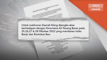 Pejabat Setiausaha Kerajaan Negeri (SUK) Selangor meminta penduduk daerah Klang agar berwaspada dengan fenomena air pasang besar dan Monsun Timur Laut yang dijangka berlaku mulai September hingga Disember ini.<br /><br />Menurut kenyataan di Facebook rasminya, pejabat SUK memaklumkan, fenomena itu boleh membawa risiko banjir dan runtuhan ban.