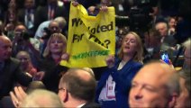 Greenpeace activists interrupted Liz Truss' speech and held up a banner reading Who voted for this?