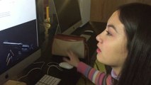 Maddie De La Houssaye checking out article by Matthew Pearl & Greg Nichol's "Secrets and Wives"