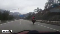 Karayolunda akrobatik hareketler yapan motosiklet sürücüsü korkuttu