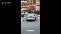 The shocking moment a police rapid response car collided with another vehicle and then ploughed into a railing in Oldham