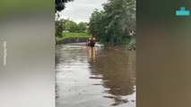 Woman Hops on Paddle Board During Floods