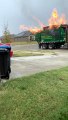 Occurred on November 7, 2022 / Fort Worth, Texas, USA<br /><br />: "A Texas homeowner noticed the neighborhood recycling truck roll up to their curb on fire. The driver had already tried using an extinguisher, but the fire persisted. Shortly after arriving, the compacting unit located on top of the truck exploded, and began shooting pressurized propane out the sides, like the sound of a jet engine. The fire was likely fueled by a flammable non-recyclable object. The homeowner and driver both called the fire department. This video was taken minutes after the explosion."