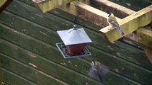 This person watched a pair of blue jay birds munching on peanuts on a platform feeder. Though they seemed anxious about a human presence, that still didn't stop the birds from carefully choosing the heaviest and finest peanuts out of the feed.