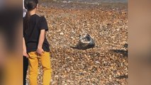 An injured seal was left whimpering after it became stranded on the cobblestones of a harbour for more than 24 hours.<br />Heartbreaking video shows fisherman Kit Gallagher approaching the poor creature 'crying for help' after the tide brought it to shore.