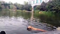 Un cygne attaque un chien dans un lac