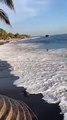 Un surfeur ravagé par une grosse vague en bord de plage