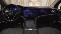 Mercedes-Maybach bereichert das dynamische Purpose Design des EQS SUV von Mercedes-EQ um exklusive Elemente, die ihm einen ganz eigenen Charakter verleihen. Auf der Haube thront statusprägend der Mercedes Stern. Die Front ist geprägt vom markentypischen Black Panel mit vertikalen, verchromten Zierstäben in dreidimensionaler Tiefenoptik. Das große Black Panel ist erstmals glattflächig geschlossen. Das Hightech-Element für die Radarsensoren ist vollständig integriert und nicht mehr sichtbar. Verchromte, filigrane Lamellen finden sich auch am Lufteinlass des Stoßfängers wieder. <br /><br />Die Gestaltung im Innenraum folgt ebenso konsequent dem Maybach Credo „Was gut ist, muss auch schön sein“. Ein Highlight für die Frontpassagiere ist der serienmäßige MBUX Hyperscreen mit „Zero Layer“ und Mercedes-Maybach spezifischen Start-up-Animationen auf allen drei Displays. Die visuelle Gesamterscheinung ist speziell für den Mercedes-Maybach EQS SUV in einem edlen Tiefblau gestaltet. Zu den zahlreichen exklusiven Merkmalen zählt die animierte Anzeige des Kombi-Instruments im „MAYBACH“-Modus. Die Zeiger in den beiden Tuben sind wie ein Seidenschal gestaltet, der sich entsprechend der Geschwindigkeit und des Fahrstils elegant im Wind bewegt. Parallel verändern die Ziffern ihre Größe und werden dynamisch ein- oder ausgeblendet. Die Einfassung der Rundinstrumente ist im markentypischen Roségold gehalten.