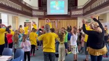 Singing inside Crediton Congregational Church during Good Friday Walk of Witness (Will Goddard, Crediton Courier)