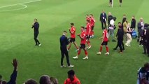 Luton Town's players applaud the visiting fans after a 1-1 draw at Reading