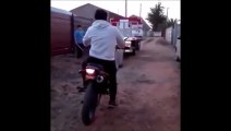 Ce motard essaie d'arreter une moto sans pilote et c'est la gamelle