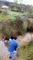Amazing style of people for crossing stream in jungle