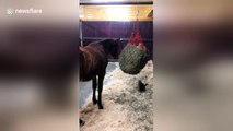 Kittens befriend horses in barn