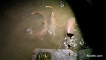 Swarming fighting sharks are fed, over/underwater footage
