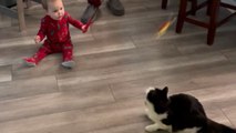 9-month-old baby wiggles a cat toy and engages with a cat