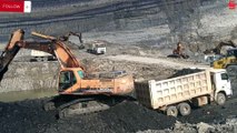 Excavator cutting mountain, excavator loading stone to dump truck